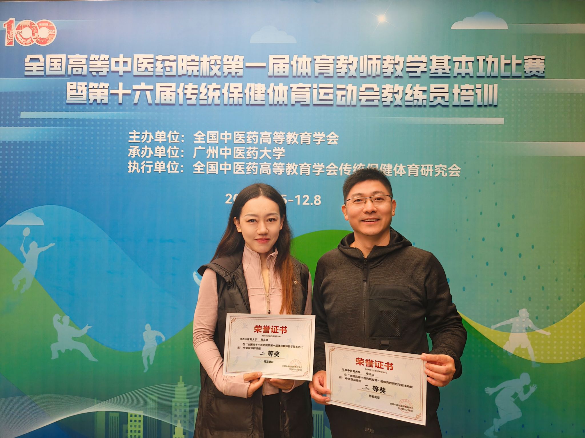 江中新闻网讯(通讯员 陈玮)12月8日,全国高等中医药院校第一届体育教师教学基本功比赛暨第十六届传统保健体育运动会教练员培训班在广州中医药大学闭幕。本次活动由全国中医药高等教育学会主办,广州中医药大学承办,来自全国各地29所中医药院校的58名教师齐聚一堂,同场竞技,我校体育健康学院熊文颖老师获得初中级组二等奖,喻治达老师获得高级组三等奖。