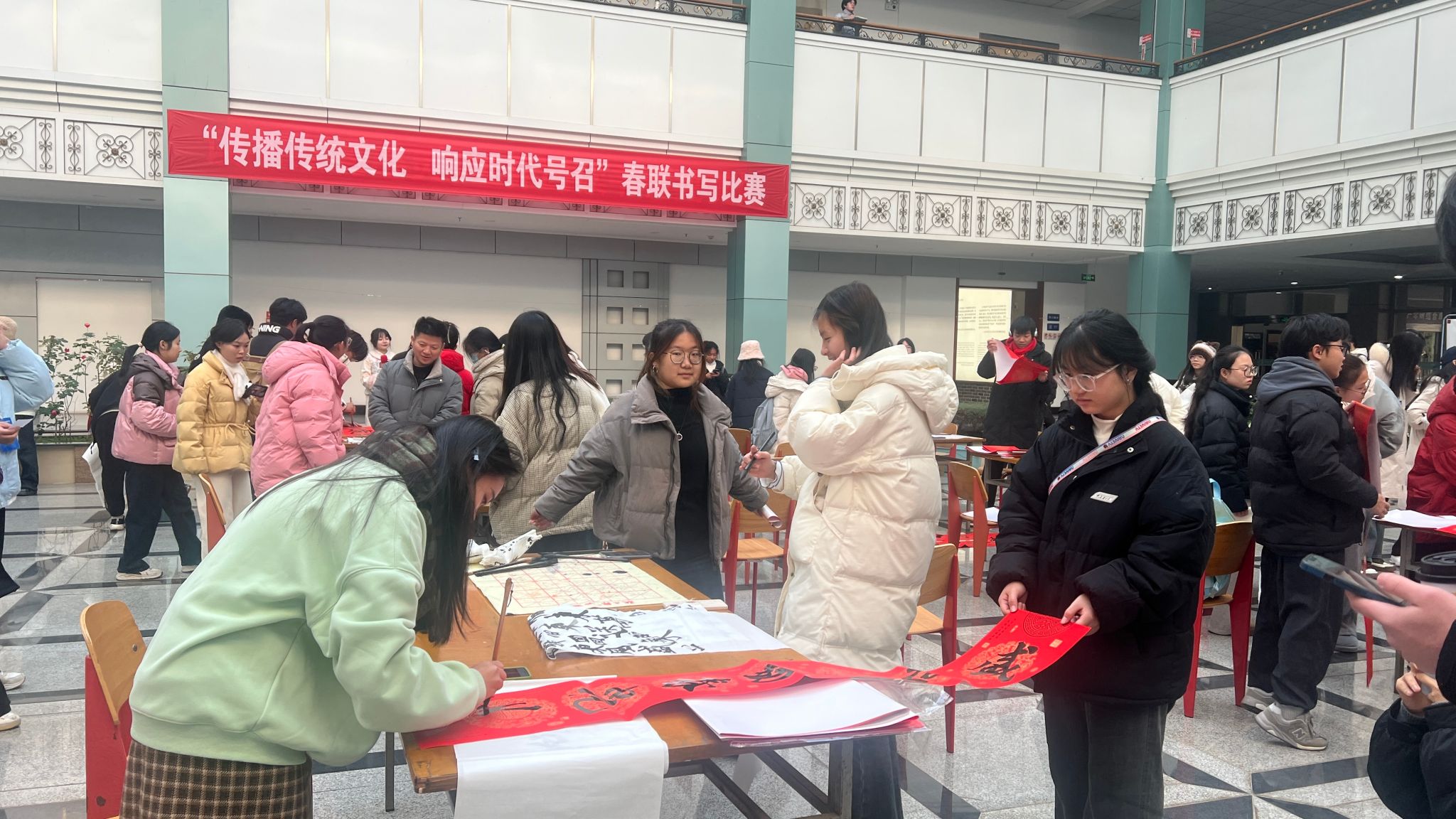 江中新闻网讯(通讯员 黎莉)12月20日下午,图书馆一楼大厅人头攒动、墨香四溢。一年一度的笔墨迎新春联书写比赛如约而至,今年活动主题为“传播传统文化 响应时代号召”。