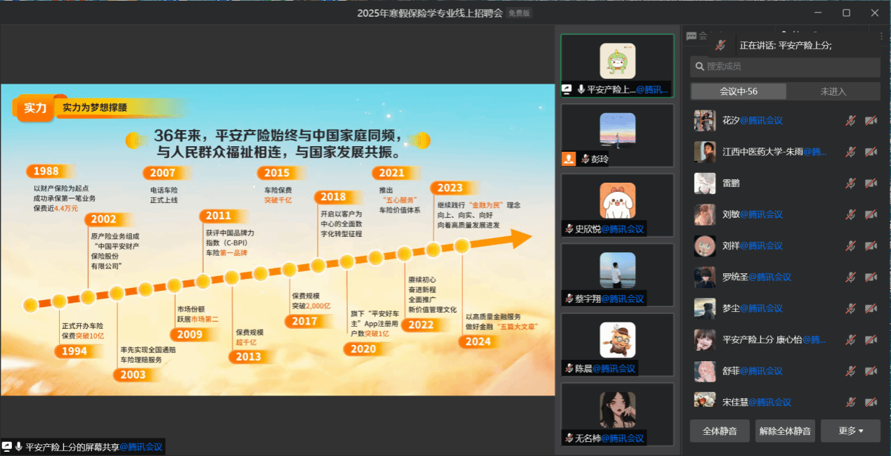 两家公司的人事招聘专员线上进行了微宣讲,向同学们介绍了公司的基本情况、招聘流程、福利待遇、岗位晋升、企业文化等详细内容,并与保险专业同学互动交流,同时为了帮助应届毕业生更加全面快速了解企业,本次线上招聘会还特别安排了供职两家保险公司的校友与同学们进行了分享交流,为即将走入职场的毕业生提供了宝贵的职业规划建议。