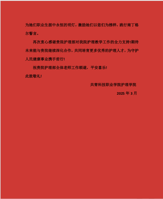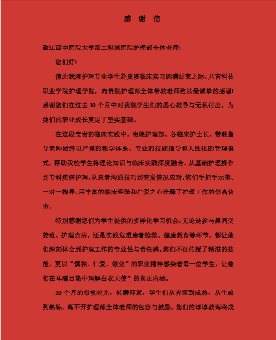 江中新闻网讯(通讯员 彭志鹏)3月4日,二附院科教科再次收到实习选送单位发来的感谢信。共青科技职业学院护理学院在感谢信中说道:“特别感谢您为学生提供的多样化学习机会……让她们在耳濡目染中理解白衣天使的真正内涵……”