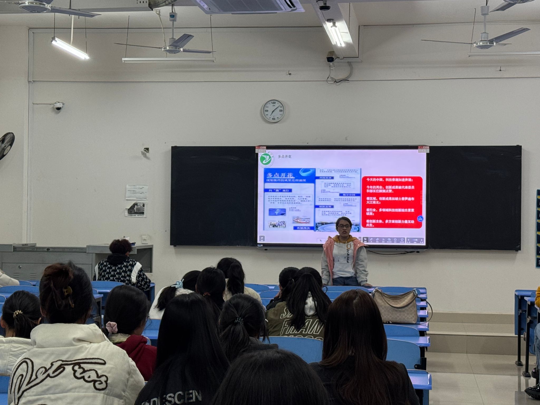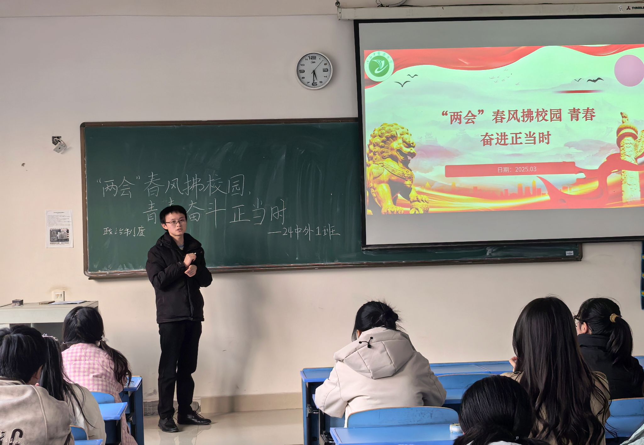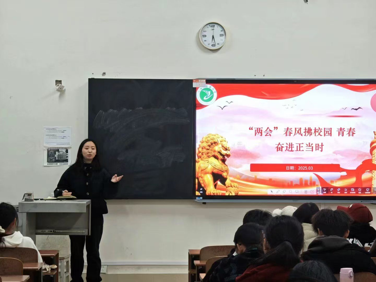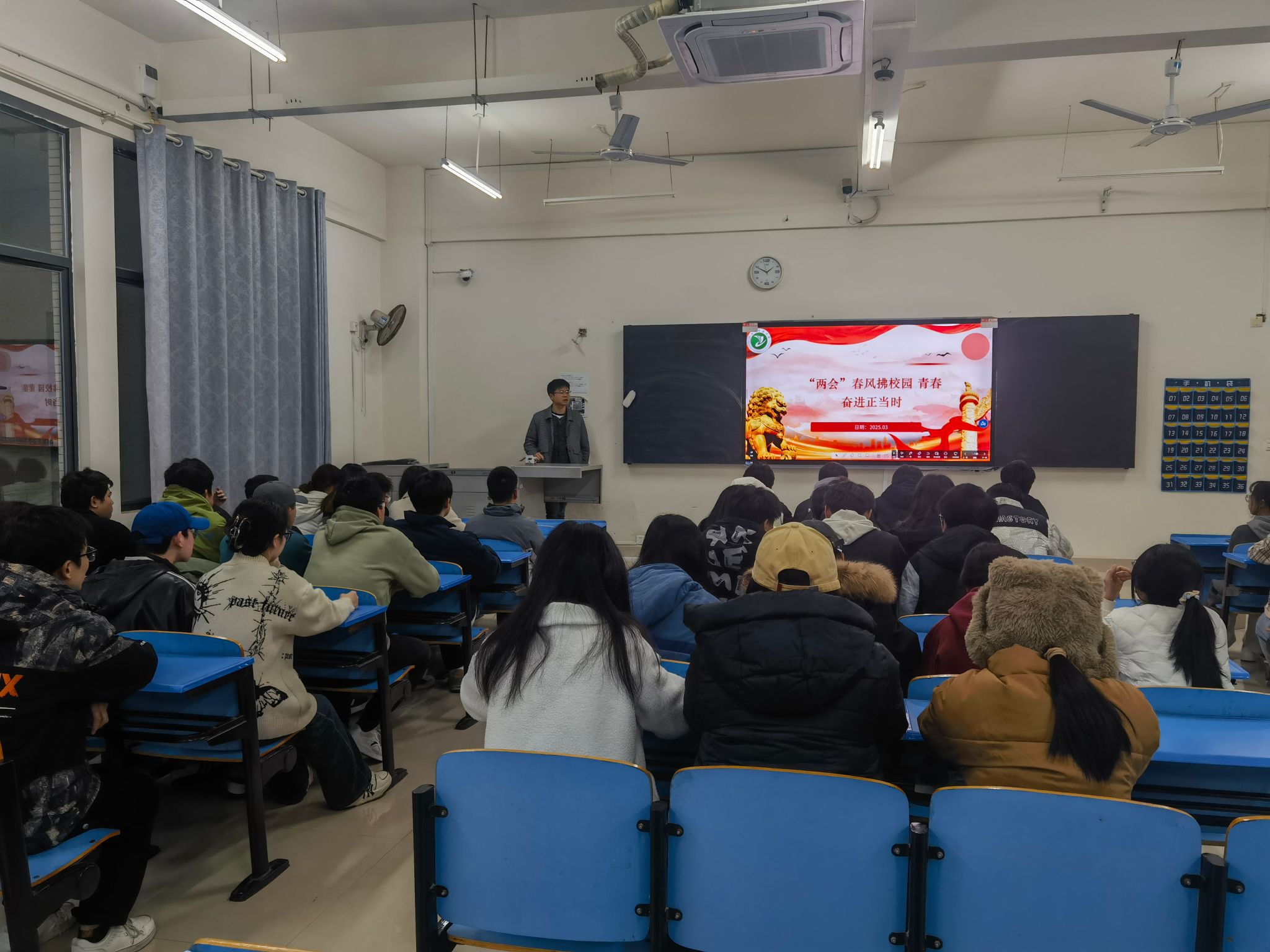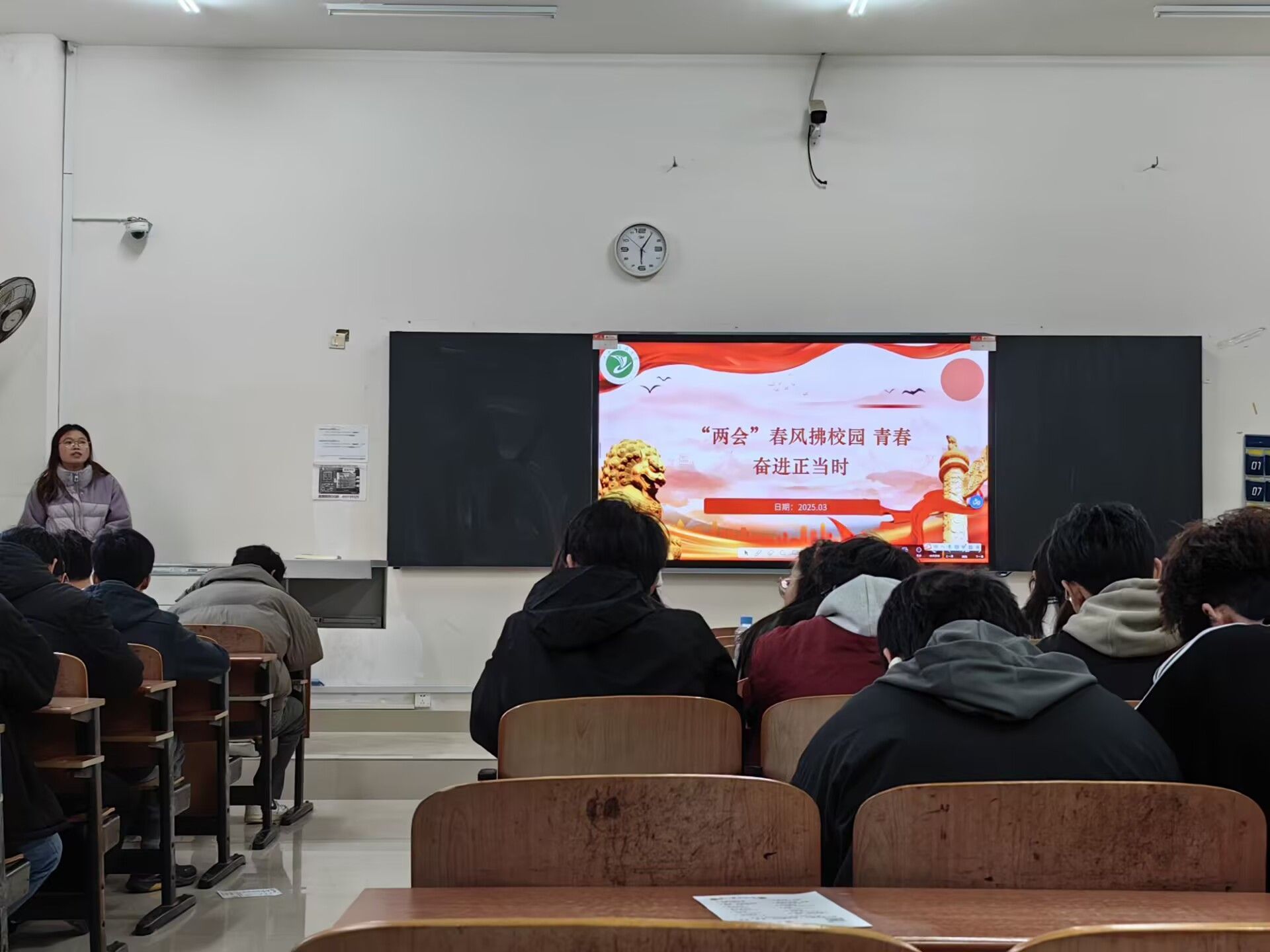 班会伊始,辅导员们通过精心制作的 PPT 和视频资料,向同学们详细介绍了今年全国两会的基本情况,包括会议议程、重要决策等,重点解读了政府工作报告中与教育、就业、经济发展等与大学生密切相关的内容,用通俗易懂的语言让同学们深入理解两会精神内涵。