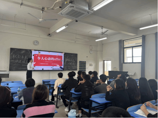4月3日,活动邀请中华财险江西分公司部门主管、南昌中支人事行政部经理范媛来2022级保险学班开展专题宣讲,范媛以“让人心动的offer”为主题,从个人简历准备、备战面试准备、聚焦面试现场、薪酬谈判策略、准备身份角色、直面工作挫折六个方面展开分享,为同学们深度解读了保险行业的就业形势、当前就业市场的动态和趋势,分析了保险行业的发展状况及未来趋势,重点介绍了中华联合财险公司的发展历程和人才需求等情况。