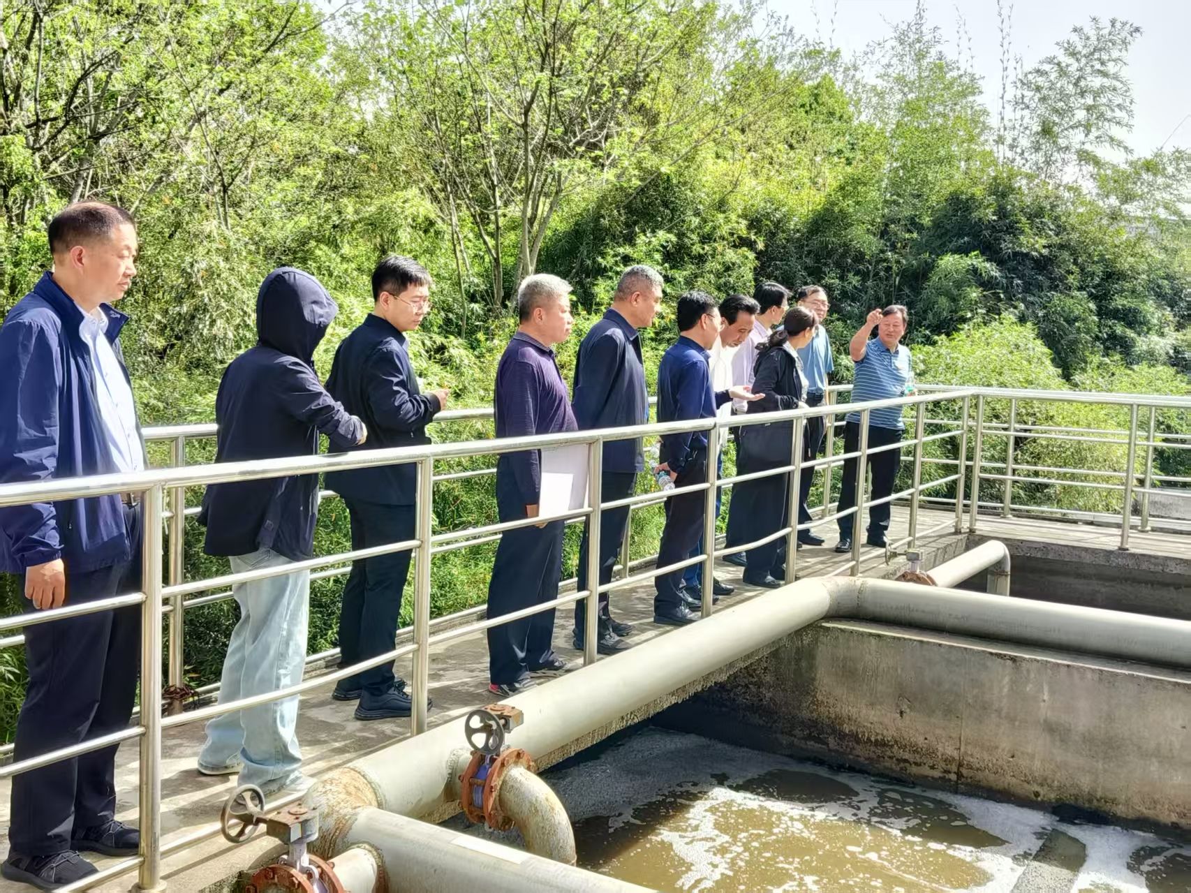 在学校中水回用站现场,后勤保障服务中心负责人从污水的收集、沉淀、氧化到生物处理环节去除有机物和氮磷等污染物,再到深度过滤与消毒最终产出可回用的中水,最后应用到校园绿化灌溉与冲厕等方面详细介绍了中水回用的工艺流程。调研团一行认真聆听,不时就关键技术节点、设备运行维护、处理成本、节水成效等方面进行了咨询,学校有关陪同工作人员均一一给予详尽解答。调研团一行对学校中水回用项目取得的成绩给予高度评价,表示学校在中水回用实践中的探索与创新,为他们提供了宝贵的参考范例,具有很强的借鉴意义。