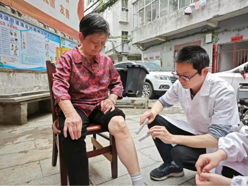 80岁的张奶奶常年受膝关节疼痛困扰,李富老师为其施以艾灸疗法。艾条温和的热力渗透穴位,张奶奶疼痛逐渐缓解,脸上露出舒心的笑容。“这艾草香闻着安心,膝盖暖乎乎的,舒服!”张奶奶对志愿者们竖起大拇指。志愿者们还耐心向她传授居家保健知识,建议日常艾灸足三里等穴位以巩固效果。
