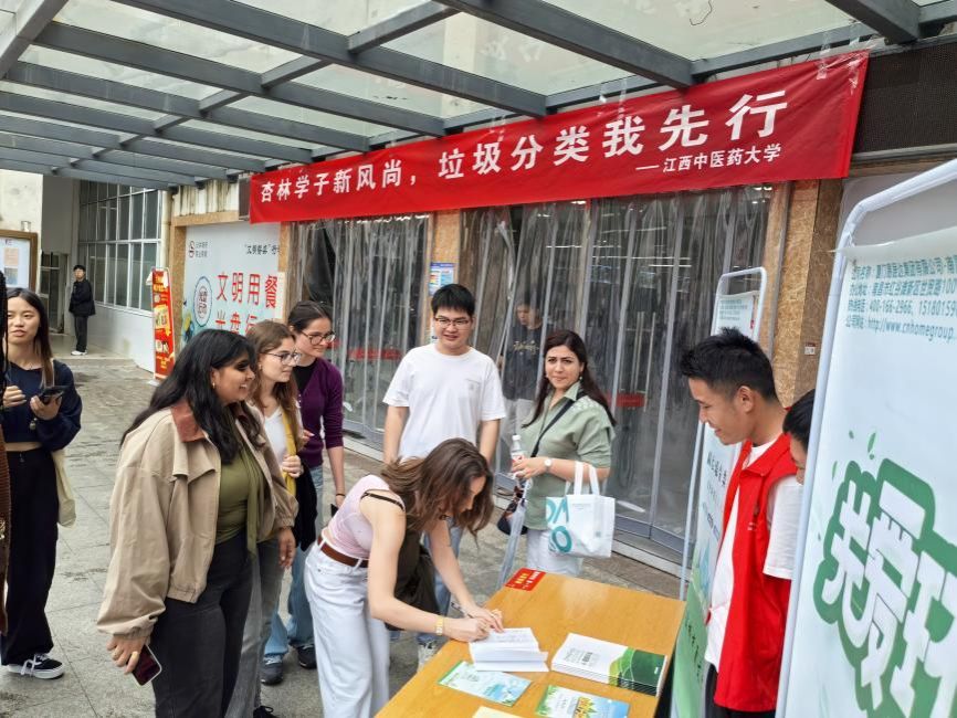 活动现场气氛热烈,吸引了众多师生参与。工作人员向广大师生发放垃圾分类宣传手册并讲解垃圾分类知识,传递环保理念。师生们学习热情高涨,积极参与其中,并在承诺共同践行绿色校园理念的横幅上签名。