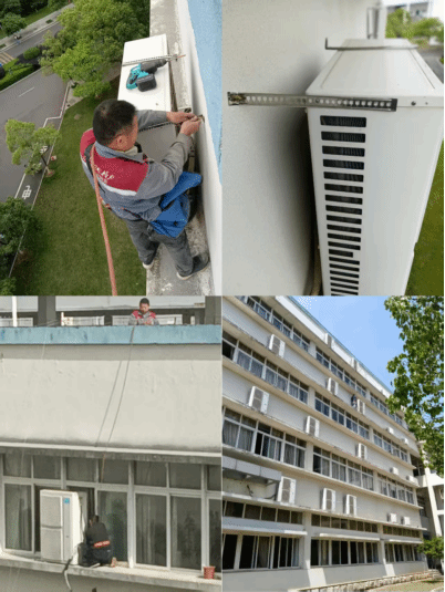 专业技术人员逐台检查每一台空调的固定情况,对存在隐患的空调外机采取加装膨胀螺丝、空调拉杆等措施。经过连续多日作业,累计完成近500台空调外机的加固,彻底消除高空坠物风险,为师生筑起一道“空中安全屏障”。