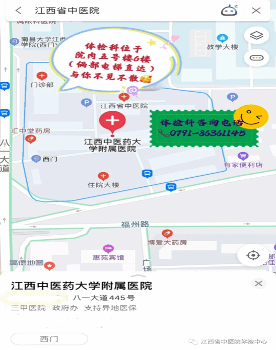 1、南昌市八一大道445号江西中医药大学附属医院5号楼6楼健康管理体检中心,两部电梯直达6楼。