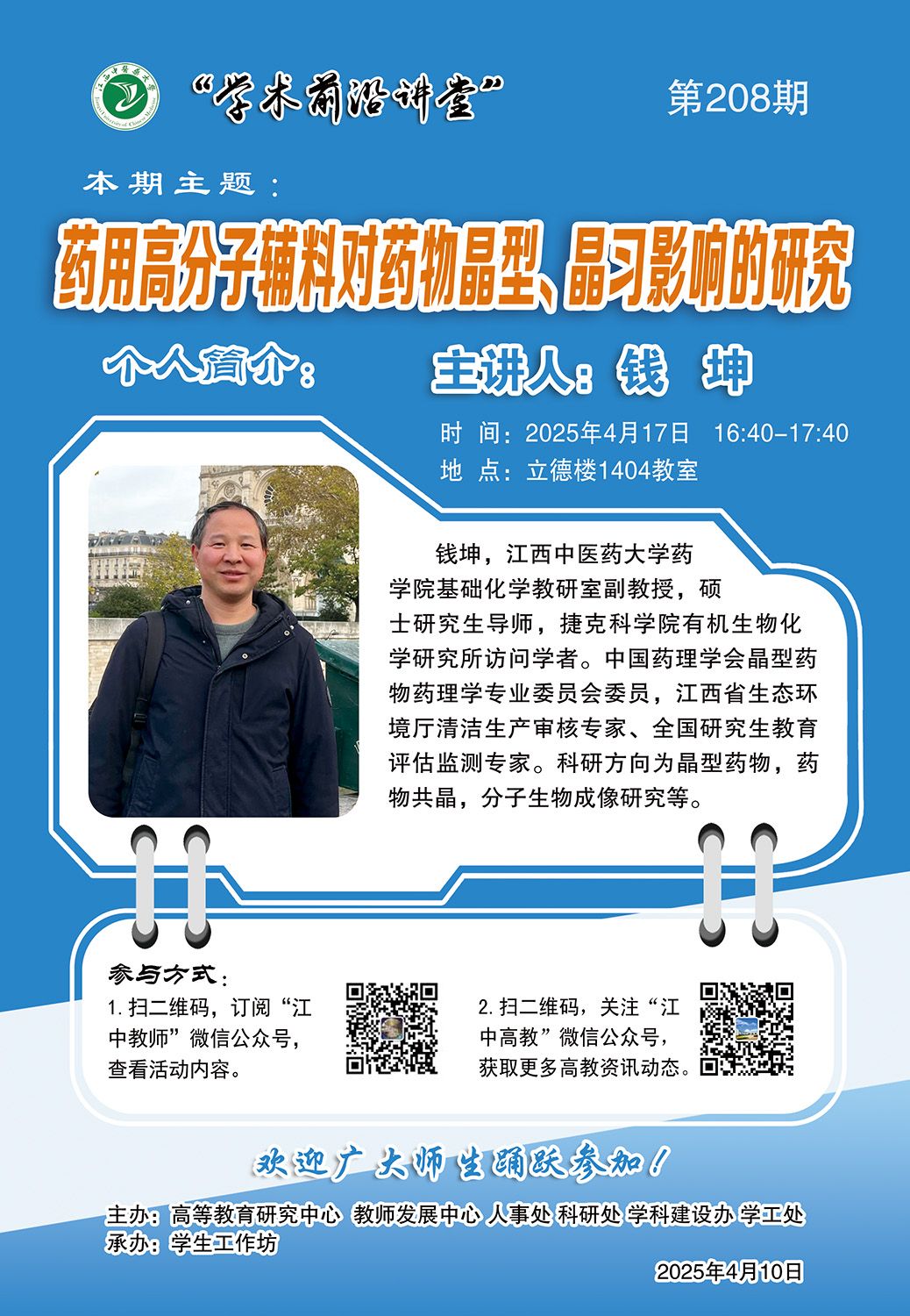 个人简介:钱坤,江西中医药大学药学院基础化学教研室副教授,硕士研究生导师,捷克科学院有机生物化学研究所访问学者。中国药理学会晶型药物药理学专业委员会委员,江西省生态环境厅清洁生产审核专家、全国研究生教育评估监测专家。科研方向为晶型药物,药物共晶,分子生物成像研究等。